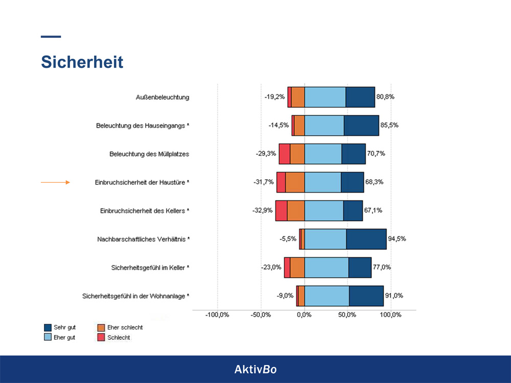 – Einbruchsicherheit der Haustüre: 68,3 % der Mieter bewerten sie als sehr gut. Hier sehen wir Handlungsbedarf. Wir werden umgehend Fachfirmen beauftragen, den Zustand der Türen zu überprüfen. Unabhängig davon: Das Ergebnis zeigt, wie wichtig es ist, dass alle Parteien darauf achten, dass die Haustüre geschlossen ist.