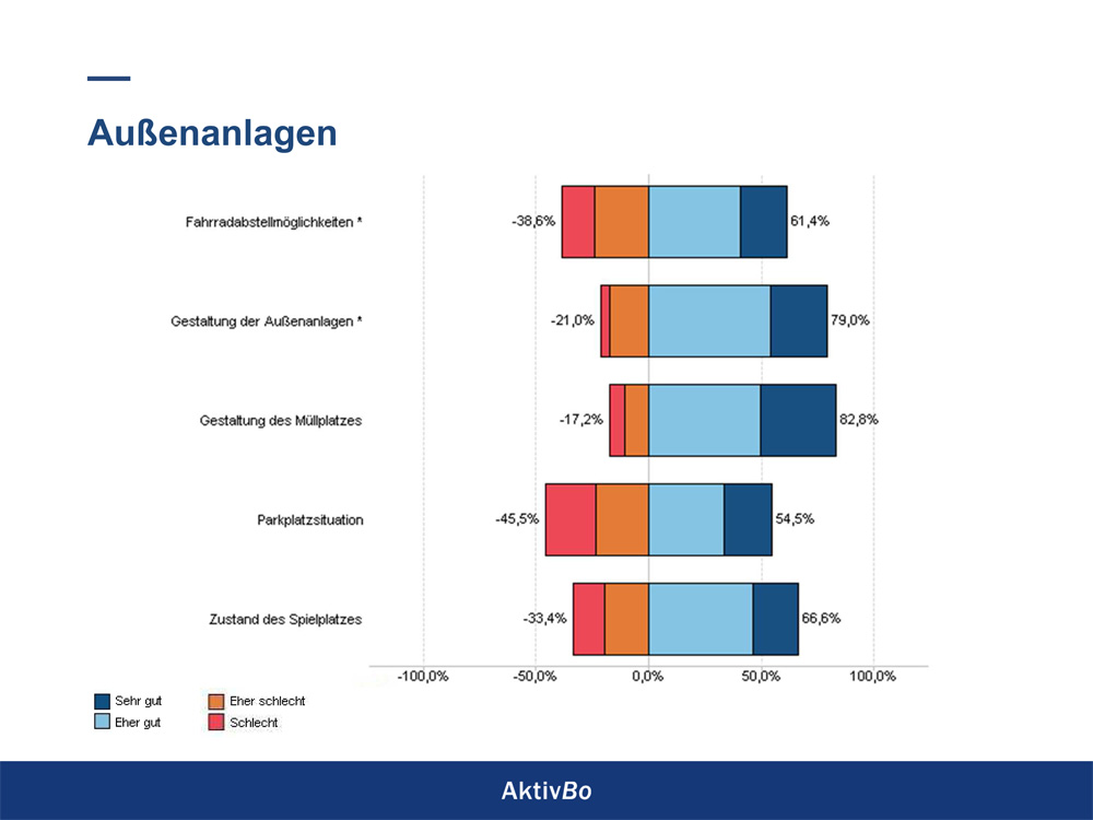 – Müllplatzbeleuchtung: 70,7 % sind mit der Beleuchtung des Müllplatzes zufrieden. Das Ergebnis könnte besser sein. Fachfirmen werden die aktuelle Situation in den Wohnanlagen überprüfen und uns Verbesserungsvorschläge unterbreiten.